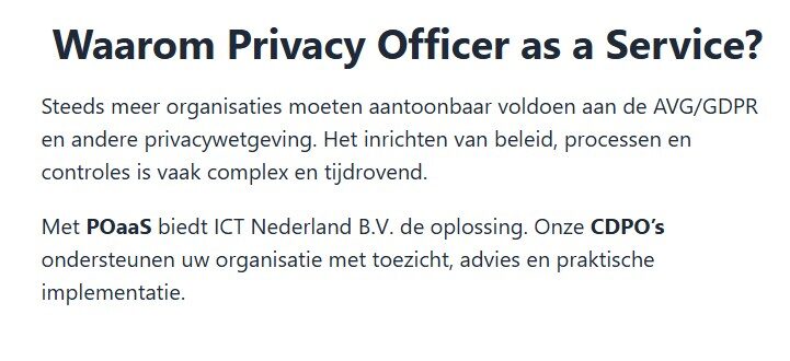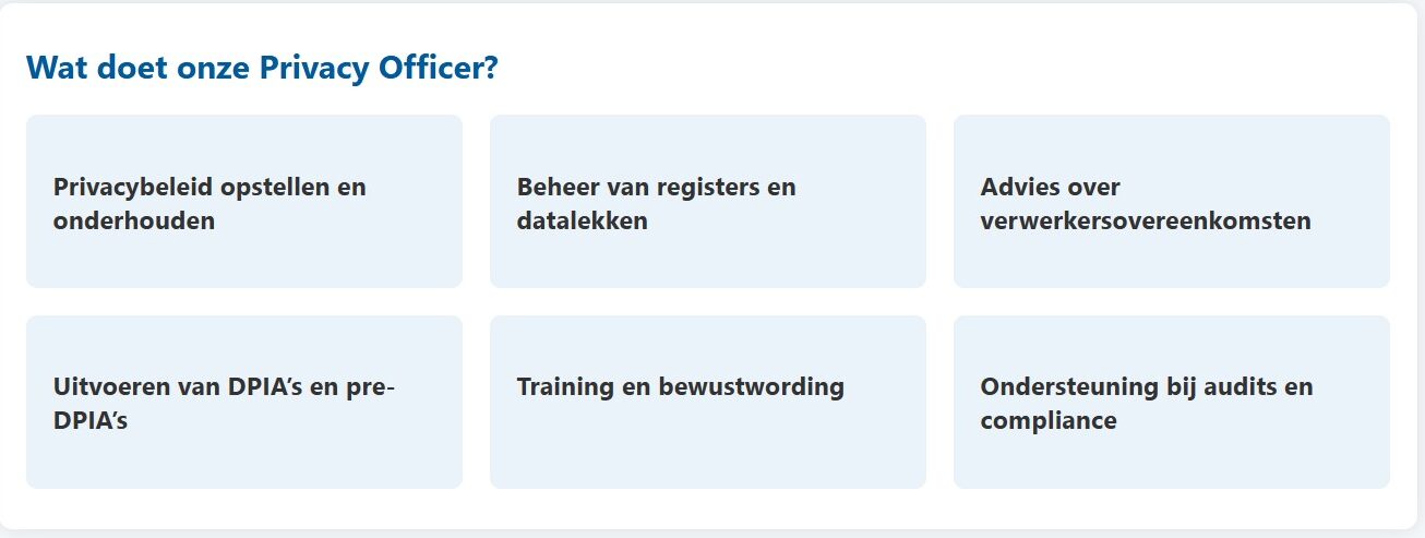 Dit is vaak gunstiger dan zelf een Privacy Officer in dienst nemen. Vraag gerust naar de mogelijkheden en een voorstel op maat.